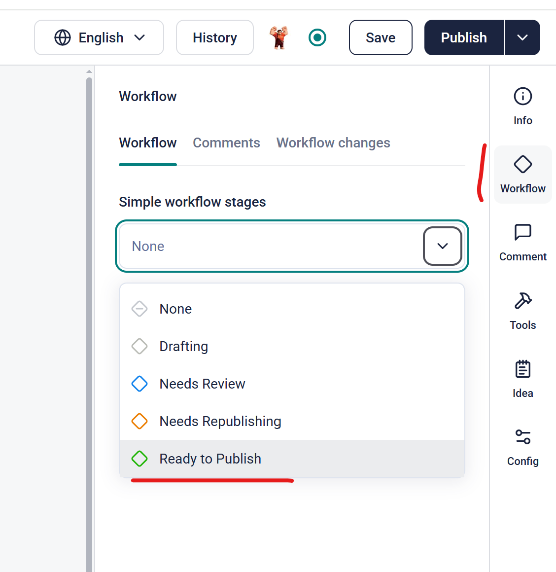In order to Publish the content you need to set the workflow stage to Ready to Publish using the Workflow panel on the right of the screen.